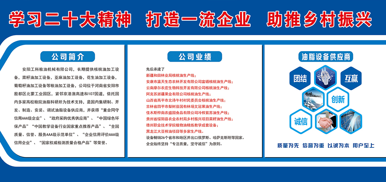 安陽工科糧油機械有限公司,長期提供核桃油加工設備,茶籽油加工設備,菜籽油加工設備,亞麻油加工設備,花生油加工設備,葡萄籽油加工設備等糧油加工設備,公司位于河南省安陽市殷都區北蒙工業園區,緊鄰京港澳高速和107國道,依托國內多家高校糧院油脂科研所為技術支持,是國內集研制、開發、制造、安裝、調試油脂設備供應商。先后承建了新疆和田林業局核桃油生產線,安康市瀛天生態農林開發有限公司富硒核桃油生產線,云南摩爾農莊生物科技開發有限公司核桃油生產線,阿克蘇浙疆果業有限公司核桃油生產線,山西省高平市北詩午村村民委員會核桃油生產線,吉林省四平市梨樹縣國有林場文冠果油生產線...